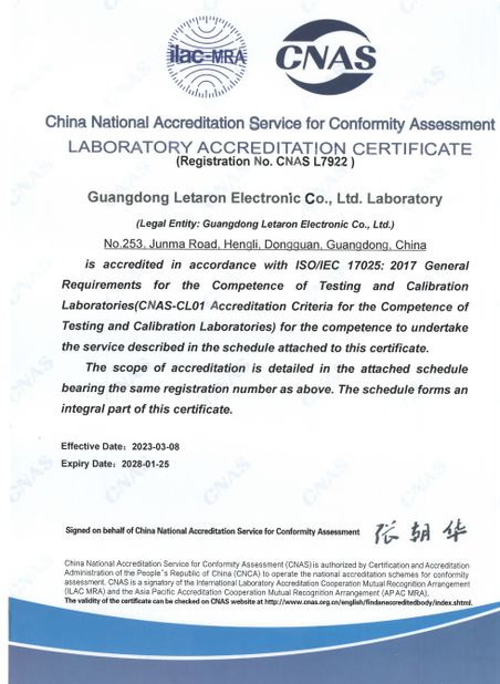 Letaron hat ein hochwertiges Technologie-Forschungszentrum aufgebaut und stabile Kooperationsbeziehungen mit maßgeblichen Zertifizierungsstellen im In- und Ausland etabliert, das One-Stop-Test- und Zertifizierungsdienstleistungen für vor- und nachgelagerte Unternehmen, Käufer, Benutzer usw. anbieten kann. Im Jahr 2021 wurde es vom Ministerium für Industrie und Informationstechnologie als One-Stop-Service-Plattform für die nationale Qualitätsinfrastruktur (NQI) bewertet. Dies ist zu einem einzigartigen Wettbewerbsvorteil für Letaron geworden.